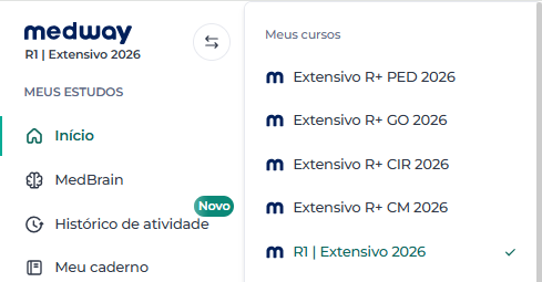 Se você possui mais de um curso ativo na Medway, pode notar que os conteúdos não aparecem todos ao mesmo tempo. Isso acontece porque a nossa plataforma organiza os materiais de forma individual para facilitar o seu foco.